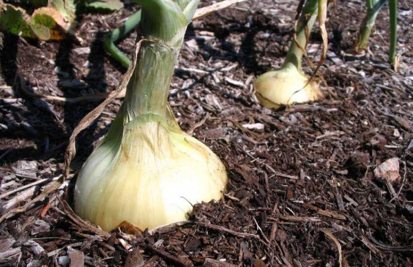 Зрелый лук определяют по пожелтевшим перьям, которые лежат на земле, и характерному окрасу сухих чешуй.