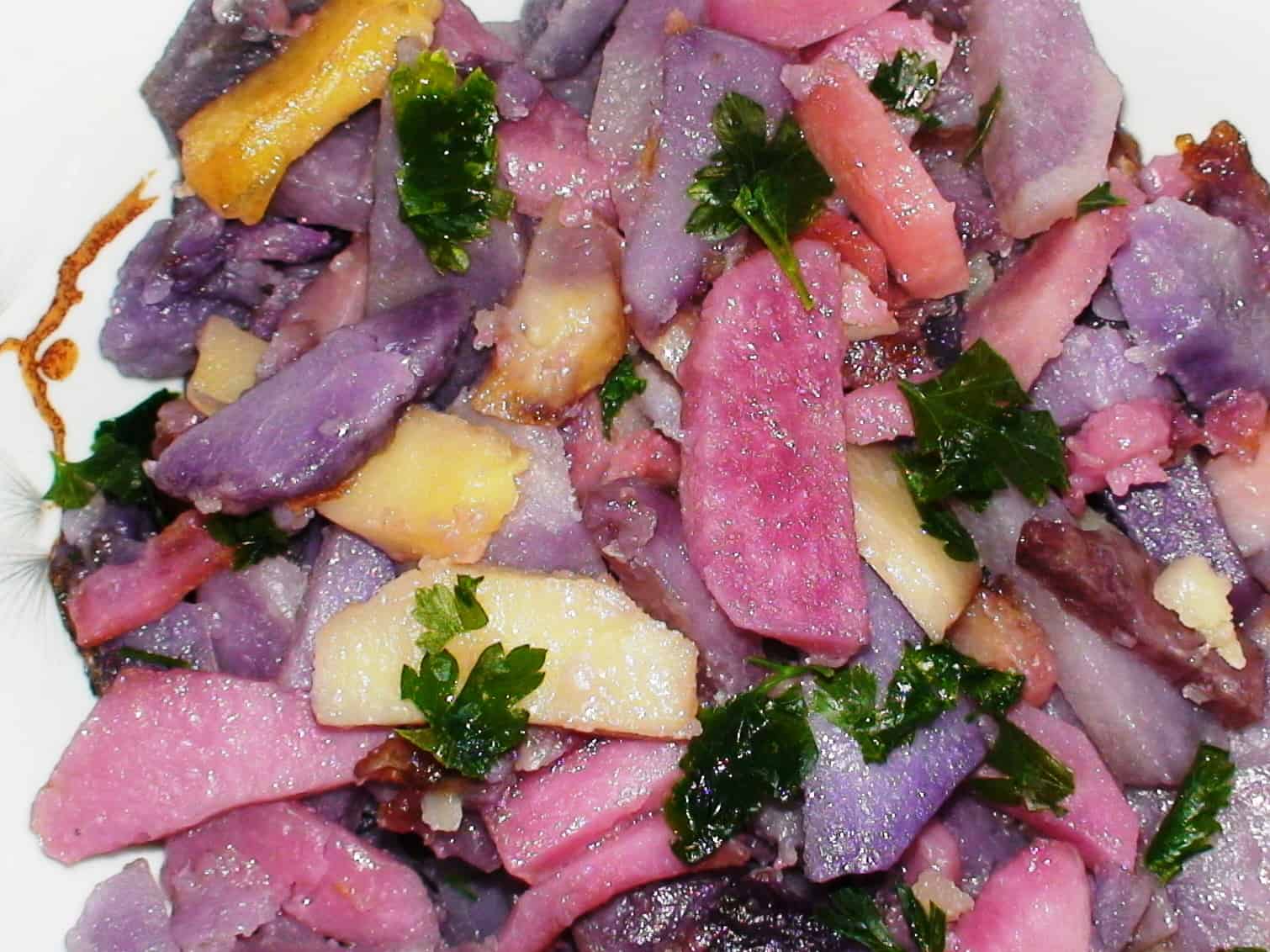 Фиолетовые виды картофеля имеют особую изюминку – нежный привкус ореха, что придает приготовленным блюдам своеобразную пикантность. Но для жарки данный картофель не подходит. Используется в основном для приготовления пюре.