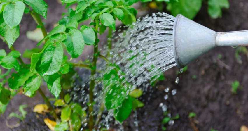При обеспечении полива необязательно придерживаться каких-либо правил. Картофель необходимо увлажнять по мере просыхания верхнего слоя грунта. Частота поливов будет во многом зависеть от погодных условий: от одного раза в 7–10 дней при нормальной погоде и 2–3 раза в засушливое лето.