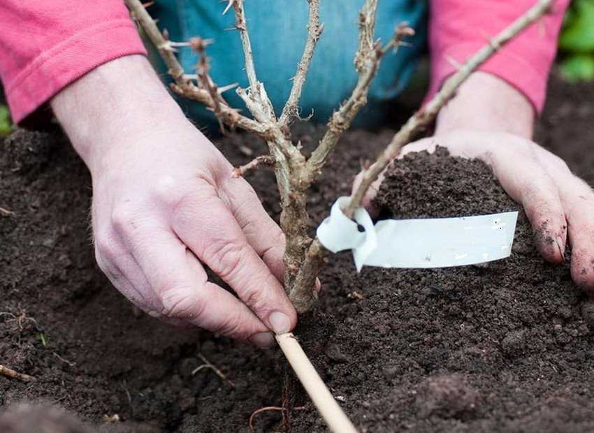 - Высаживают по центру саженец крыжовника, располагая корневую шейку на 5-7 см выше поверхности грунта, расправляют корни и засыпают землей.