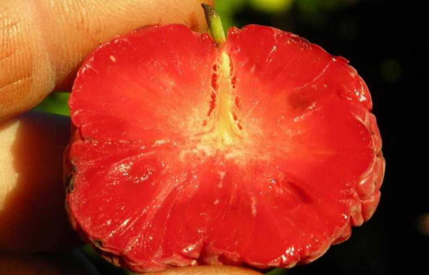 - крупные рубиново-красные плоды с небольшими семенными камерами, сочной мякотью и тонкой кожицей имеют округло-приплюснутую форму;