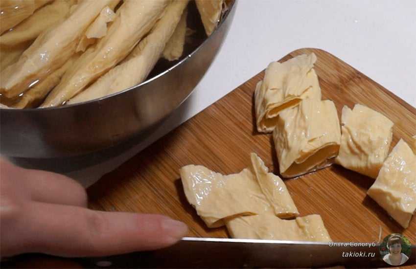 - Сушеный продукт нужно замочить в прохладной воде минимум на 4 часа. Если нет возможности оставить его на такое долгое время, то можно просто залить фучжу кипятком и оставить на пару минут для разбухания. Но при таком способе готовки вкус будет гораздо менее приятным, и многие ароматы и полезные свойства соевой спаржи не раскроются в полной мере.