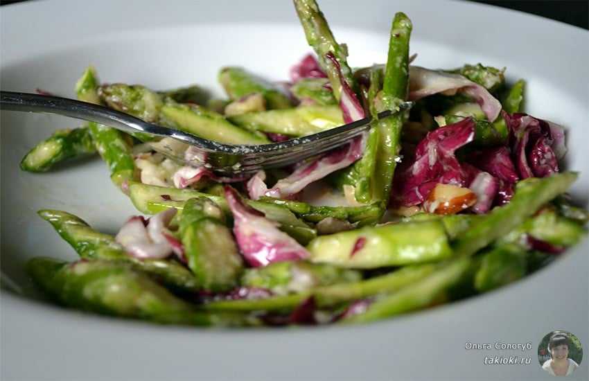 - Выложите спаржу на тарелку, посыпьте специями, луком, посолите. Влейте уксус с соусом и маслом.