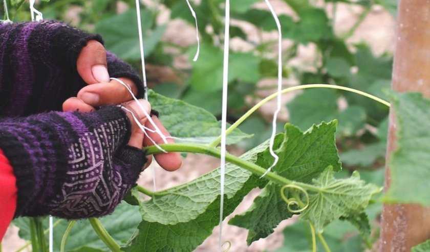 - Натянуть проволоку,сетку или прочные толстые нити для последующего размещения плетей огурцов.