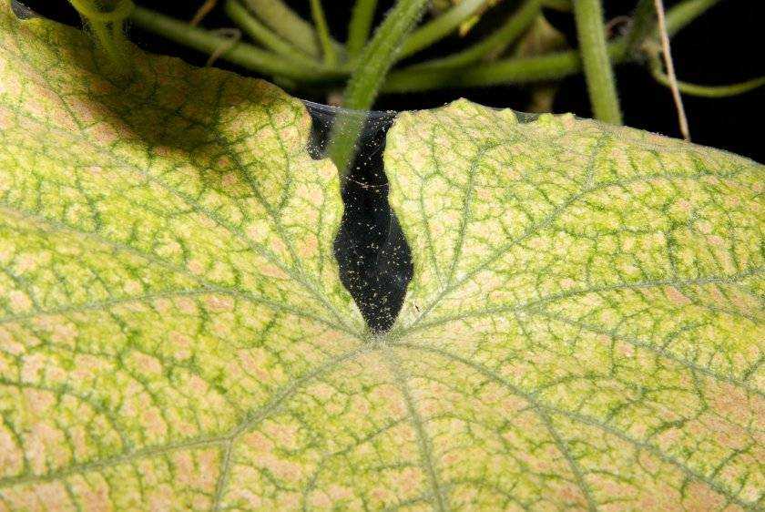Основными признаками размножения вредителя на огурцах являются мелкие белые точки на стебле, закруглившиеся концы лепестков и тонкая полупрозрачная паутина на листьях.