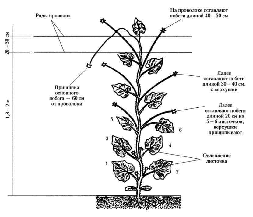Традиционные сорта огурцов на боковых стеблях образуют женские цветки, они плодородные, и на главных побегах мужские пустоцветы. Для формировки большего количества боковых стеблей и женских цветков осуществляют прищипывание. Верхушка центрального стебля обрывается после шестого листа. Боковые побеги привязываются к центральному стеблю на палке, чтобы не мешали формированию огурцов. Несколько боковых стеблей оставляют.