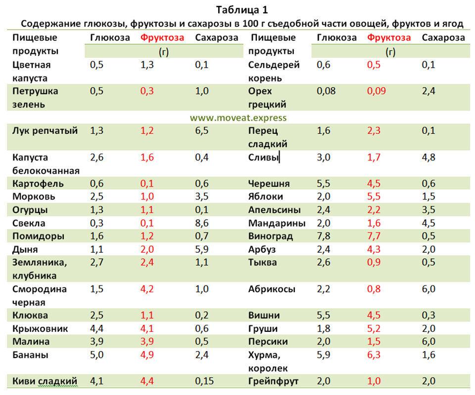 Орехи в основном содержат сахарозу (4-7 г в 100 г), что также дает 2-3,5 г фруктозы при их переваривании. Ориентировочные количества указаны в таблице 1.