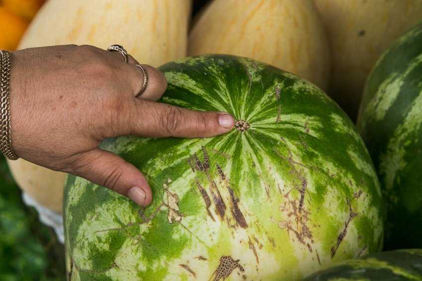 Кожицу можно слегка потереть рукой – от нее не должно ощущаться резкого запаха. Если присутствует аромат свежего сена, значит, арбуз еще не созрел.