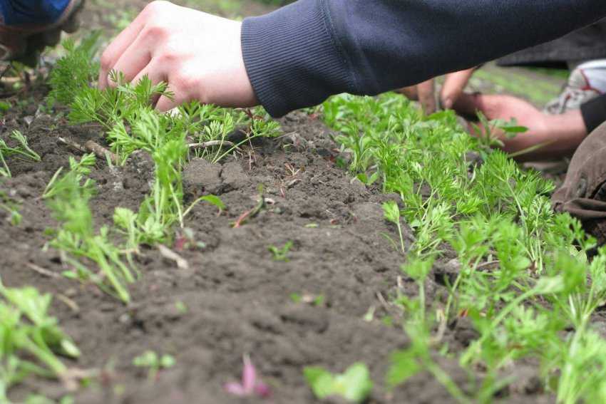 После появления всходов на протяжении всей вегетации морковные междурядья необходимо пропалывать. Это делают для того, чтобы после дождей на почве не образовывалась плотная корка, которая препятствует доступу кислорода и влаги к корням растений, а также во избежание появления на культуре сорняков.