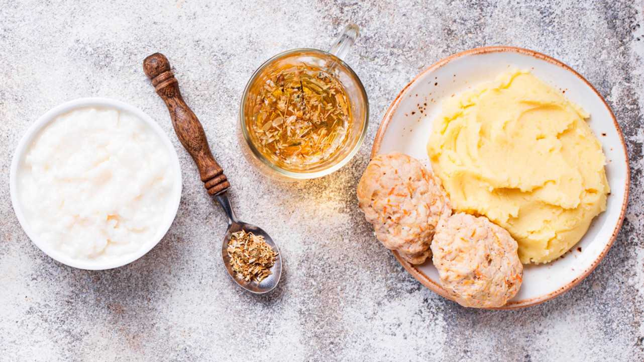- Обед — 13:00. Овощной суп с мелкой вермишелью. Картофельное пюре на воде с отварным мясом индейки. Компот.