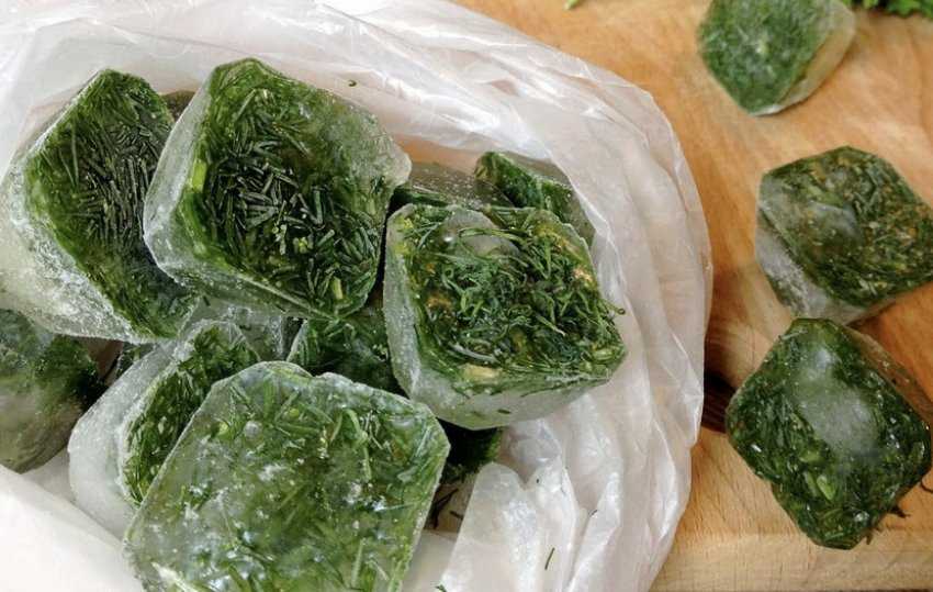 Для этого нужно использовать формочки для льда, которые необходимо наполнить мелко нарезанной зеленью и заморозить в течение суток. Затем извлечь готовые кубики из контейнера, пересыпать в целлофановый мешок и убрать в морозилку.