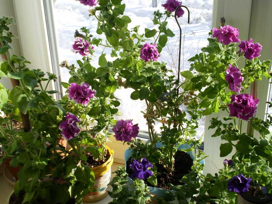 Старшие кусты петунии можно сохранить до весны, если перенести их в ясное и непромерзаемое помещение. Там должно быть светло, достаточно влажно, оптимальная t= 10-15°C (но сгодится и меньше, основное, чтобы температура не опускалась ниже 0°С). Подходящие условия бывают на затворённых верандах, утепленных или южных лоджиях, на подоконниках подъездов.
