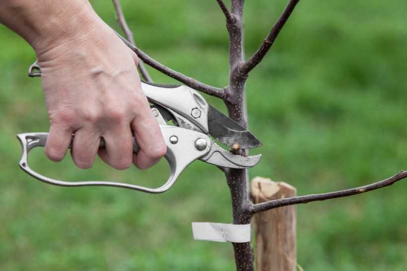 Если высаживался однолетний саженец, то у него один ровный ствол без ответвлений. Его необходимо будет срезать на высоте около 80 см, чтобы наметить появление боковых побегов, которые вскоре станут скелетными. Если высаживался двухлетний саженец, на нём уже есть несколько боковых ответвлений. Тогда для дальнейшего формирования удаляют и центральный проводник, все боковые ветви на треть, чтобы из них сформировались дополнительные ветки, которые будут служить основой.