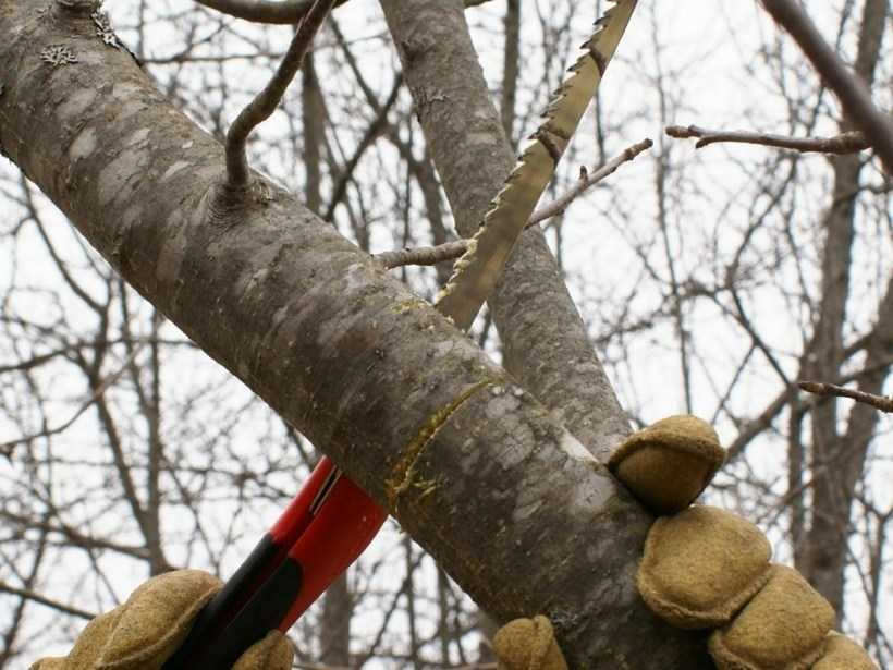 Большие ветки убираются согласно правилу: снизу сначала делается небольшой надпил, а затем с верхней стороны нужно спиливать ветку полностью. Такая методика позволит сохранить кору.