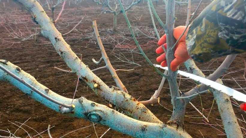 Обрезка плодовых деревьев в этот период является регулирование в данном объеме кроны роста и плодоношения таким образом, чтобы усилить ежегодные приросты и, уменьшив количество слабых обрастающих веток, улучшить питание остальных. Для этого делают прореживание и вырезают более слабые скелетные ветви со всеми обрастающими ветками на них. Укорачивают также скелетные ветви примерно на пяти-восьмилетнюю, а иногда и более взрослую древесину до того места, где были сильные приросты в прошлые годы. Сильно загущенные, запущенные кроны прореживают не сразу, а постепенно, в течение 2—3 лет; при постепенной обрезке дерево меньше страдает. Омолаживание также лучше проводить не сразу в один год, а постепенно, в течение 2—3 лет.