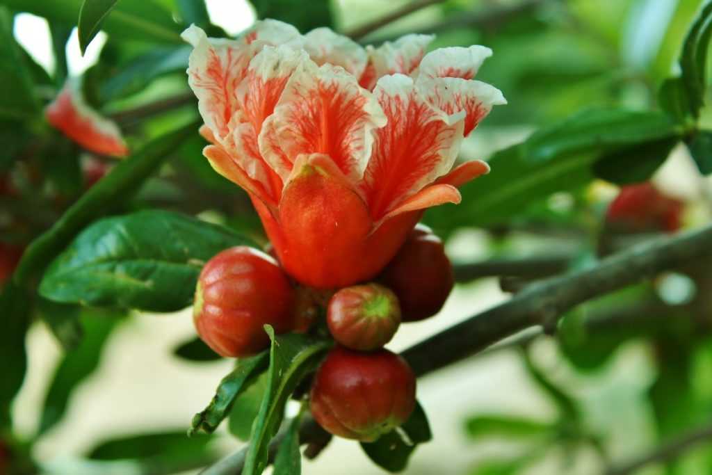 Украшают растение красные с оранжевым отливом цветки граната, которые бывают 2 видов: кувшинчатые, образующие завязь, и колокольчатые, что не формируют плодов. Радует цветением с мая по август.