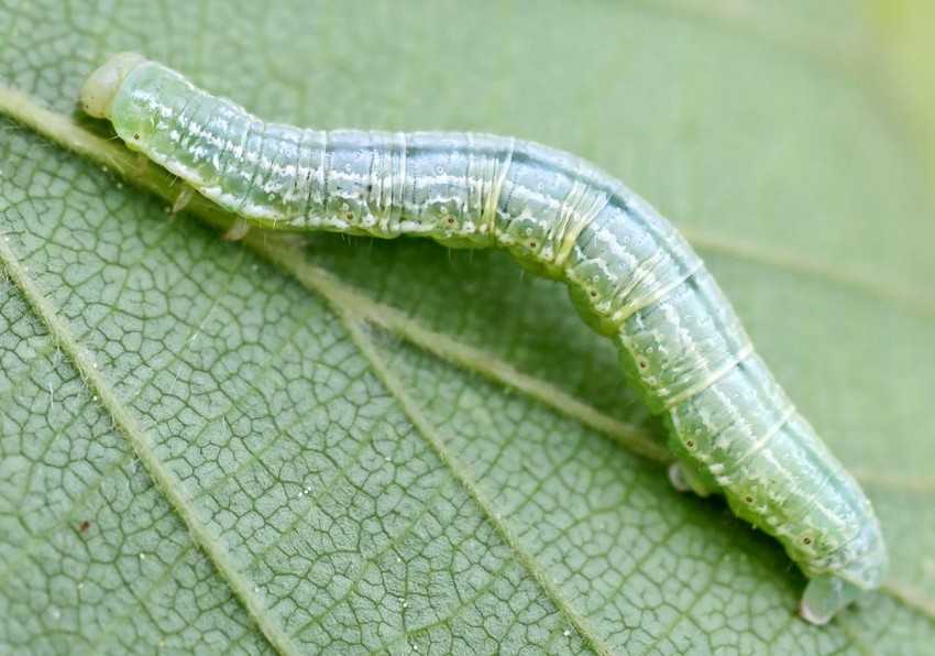 Довольно часто можно увидеть гусениц на крыжовнике. Причём это могут быть личинки разных насекомых. Чаще всего встречаются гусеницы пильщика. Они представляют собой особей зелёного окраса с чёрными точками по всему телу.