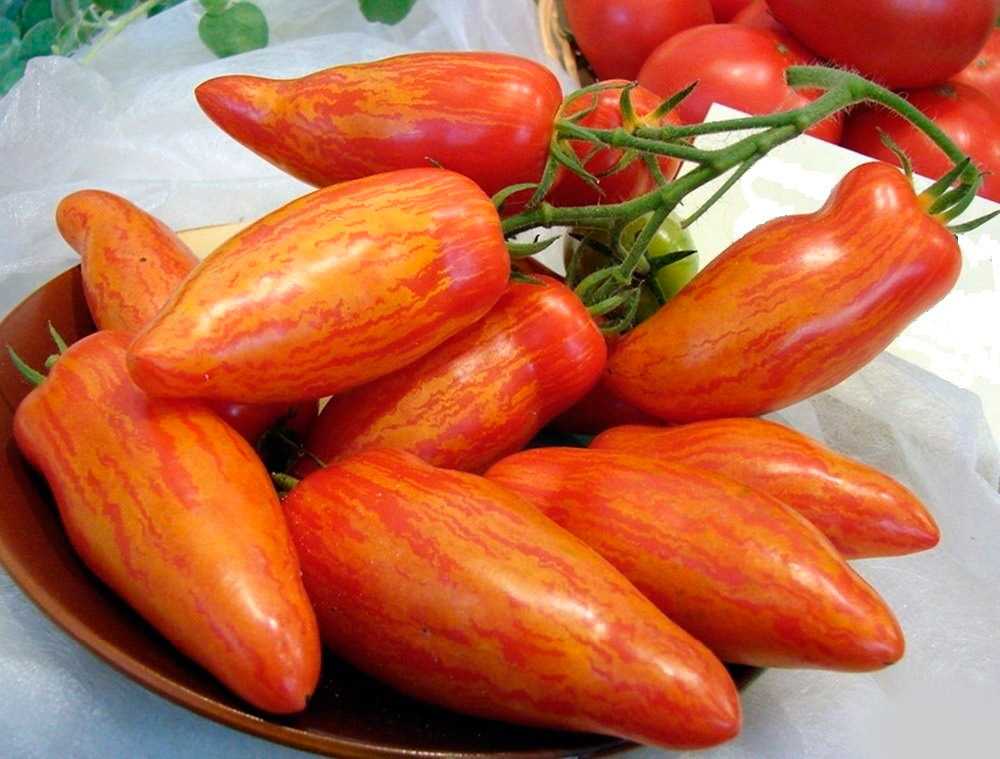 Помидоры банановидные – похожи на деформированную сосульку. Основной окрас – красный, с многочисленными, неравномерными, желто-оранжевыми продольными штрихами. Томаты плотные, крепкие, с толстой кожурой, неодинаковые, весом 50-120 г, растут кистями по 6-8 плодов.