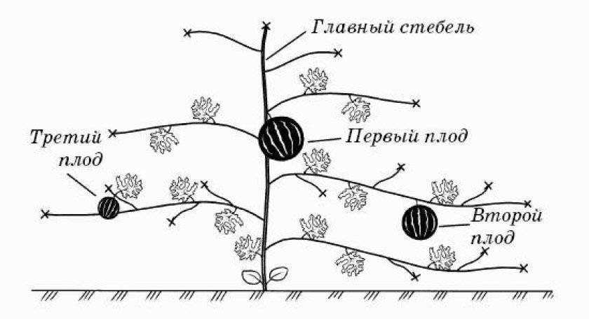 Для ускорения роста плодов арбузные плети прищипывают, оставляют 4-5 листьев над арбузом. Слабые, тонкие и бесплодные побеги вырезают «под ноль».